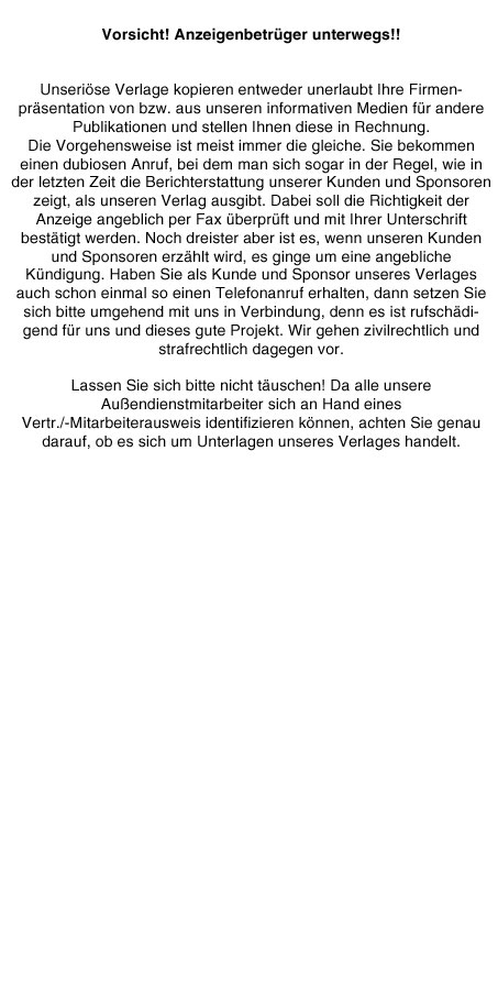 Wenn Sie mit Ihrem Unternehmen, Ihrer Firma, Ihrem Geschäft, Ihrem Verein usw. auch auf unserem Informationsplan für ein Postleitzahlengebiet Ihrer Wahl oder auf der Informationsseite, Informationskarte eine Firmenpräsentation machen möchten, so wenden Sie sich bitte an den Verlag, damit ein Mitarbeiter umgehend mit Ihnen Kontakt aufnimmt. Für weitere Fragen bzw. Anregungen oder Vorschläge für neue, uns noch nicht bekannte Notfallnummern senden Sie uns doch kurz und formlos Ihre mitzuteilende Notfallnummer mit dem Vermerk „Betreff Anfrage Notfallnummer“ zu! Wir werden Ihnen dann umgehend Bescheid geben, ob diese schon auf unserem allgemeinen Informationsplan oder der Informationskarte mit dem Thema „Notfallnummern Deutschland“ vorhanden ist oder in Zukunft aufgenommen wird.